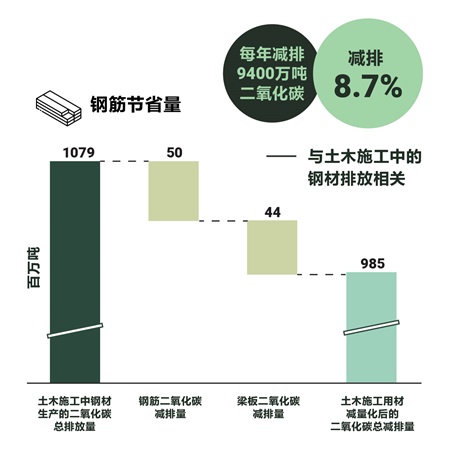 2020年中国土木施工工程在钢材节省量约4000万吨;二氧化碳减排量约9400万吨。