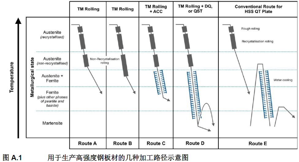 与高强钢板材一样,高强钢长材产品(即用于梁和柱的热轧开口型材)的生产路线一般会遵循图A.1中的路线A、C和D。此外,由于轧制板材与长材的轧制设备不同,后者也可以采用传统的轧制程序,如路线E的第一部分,所有的热轧都是在完全奥氏体状态下进行的,并空冷或水冷到室温。