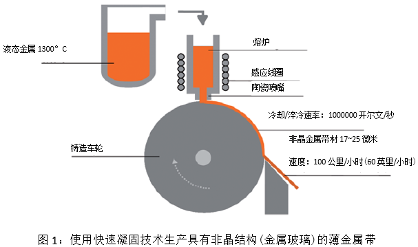 纳米晶软磁材料 (NSMM) 采用快速凝固技术制成。 该技术可用于生产厚度为 (14~30) 微米的细薄带状物。纳米晶材料是在快速凝固技术的基础上采用技术先进的一步加工法(图 1)生产而成。使用特殊的纵切和卷芯机将快速凝固的材料转化为带绕磁芯。随后,经过大约 500~600℃ 的热处理过程,使材料形成最终磁性(将最初的非晶微观结构转化为纳米晶状态)。 最终的微观结构是一种两相结构,其中的细晶粒(平均晶粒直径为 10~40 纳米)被嵌入残余非晶相。