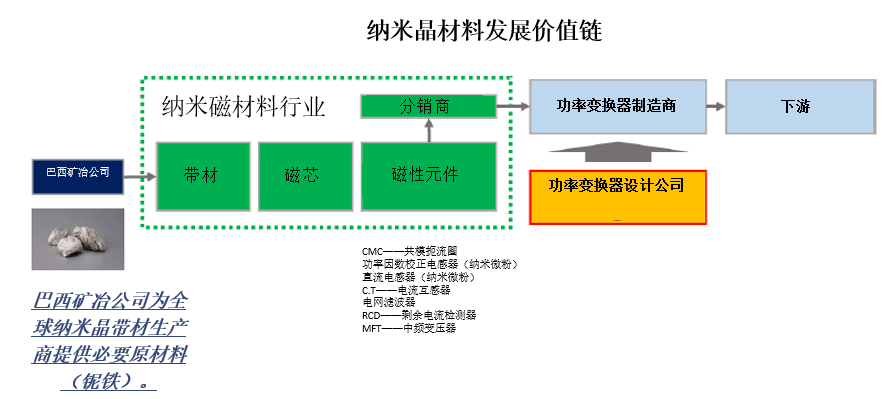 巴西矿冶公司为纳米晶软磁材料带材生产商供应铌铁原料,位于价值链的上游。但是,我们希望能助力纳米晶软磁材料市场的加速增长。因此,我们的战略是与整个价值链环节的所有利益相关者合作。价值链示意图如下。