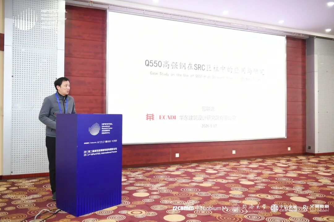 华东建筑设计研究院有限公司包联进总工随后作了题为“Q550高强钢在SRC巨柱中的应用与研究”的报告,介绍了超高层结构的结构体系与受力特点,列举了高强钢的工程应用实例,并分享了华东院相关课题成果的落地与实践情况。