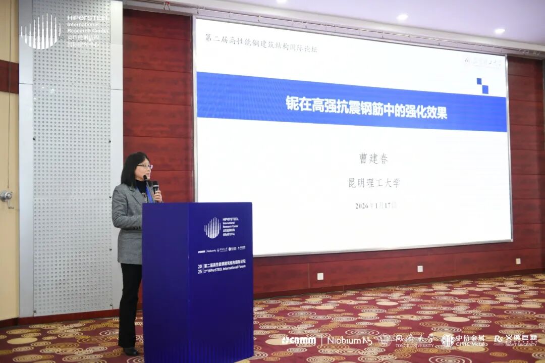 昆明理工大学曹建春教授就“铌在高强抗震钢筋中的强化作用”作了报告,内容涵盖高强抗震钢筋的发展与应用,系统分析了铌含量对高强钢筋抗震性能及强韧化机制的影响,探讨了铌对过冷奥氏体转变及其组织性能的作用,并介绍了铌钒复合微合金化钢筋的韧化机制。