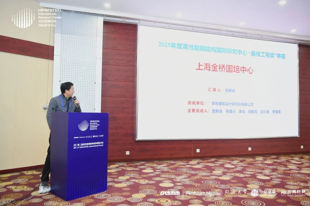 论坛最后的2025年度高性能钢结构“最佳工程奖”环节由同济大学相阳副教授进行主持。相阳副教授介绍了“最佳工程奖”设立的背景和本年度“最佳工程奖”的评审过程,宣布本年度获奖项目为“上海金桥国培中心”。该获奖项目由华东建筑设计研究院有限公司完成,包联进总工代表为获奖项目作报告。“最佳工程奖”评审专家一致认为:上海金桥国培中心项目以卓越的设计理念以及创新的高性能钢结构应用,为行业发展提供了宝贵经验,产生了显著示范效应。
