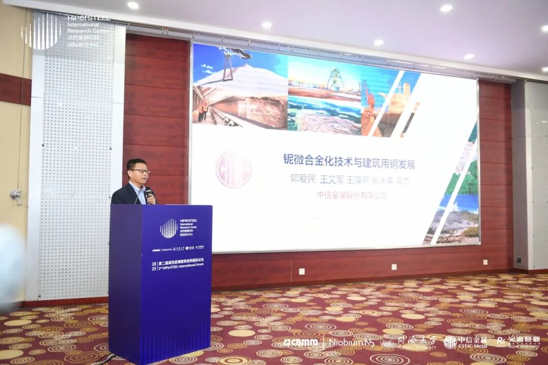 王文军博士代表中信金属股份有限公司作了题为“铌微合金化技术与建筑用钢发展”的报告。报告内容包括钢中铌的作用、建筑用钢的发展与应用,指出高强钢未来可能迎来快速增长的态势,并提出多项含铌钢材可作为实现低合金钢高质量、低成本、高效生产的新选择。