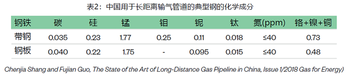 表2列出了中国项目中板材和卷材采用的API X80钢的典型成分,以及X80钢采用了低碳含量和多达0.10%的铌。