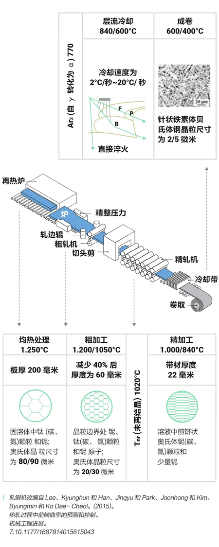 以下热轧机各阶段示意图,显示了热轧过程中奥氏体晶粒尺寸的变化情况。从再热炉开始,晶粒在机械作用下持续细化。如果能够在热机械加工工艺流程中妥善设计变形顺序和温度,则可有效实现晶粒细化,并可确保精加工后的材料具有煎饼形奥氏体晶粒结构。经过层流冷却后,这些晶粒即可转化为超细针状铁素体或贝氏体。含有针状铁素体和贝氏体的更精细均匀微观结构,将可确保材料同时具备出色的高强度和高韧性。