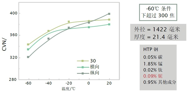 多次实践已成功证明,当钢材的精细均匀微观结构中含有不超过0.10%的铌时,即可确保其具有出色韧性。例如,针对欧洲生产的0.10%铌含量的X70级螺旋钢管进行夏比冲击试验时,其能量值上限超过了200焦,且转变温度范围达到了-20℃~-65℃。当钢管直径为1067毫米时,其能量值上限超过270焦,且转变温度约为-70℃;而对于0.05%铌含量的同等X70级钢管,其能量值上限约为200焦。0.10%铌含量的APIX70级钢管的转变温度在-60℃以下(低于0.05%铌含量的APIX70级钢管)。