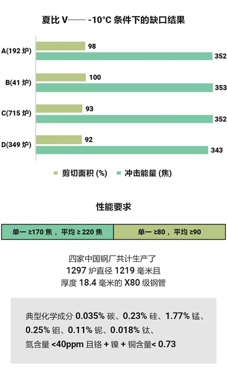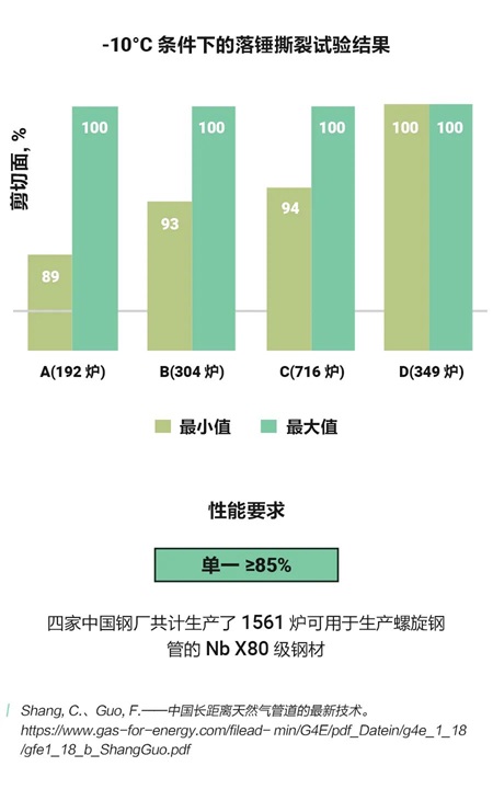中国生产的螺旋钢管也表现出良好性能。下图所示为夏比冲击和落锤撕裂试验(DWTT)结果。